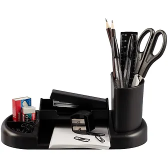 Готовый набор с наполнением. Устойчивая подставка в лаконичном стиле изготовлена из высококачественного пластика. В комплекте 12 предметов: 2 ручки, 2 карандаша, линейка, точилка, ластик, 30 скрепок, степлер №10, 1000 скоб, ножницы, блок бумаги для записей. Наполнение может отличаться от представленного.