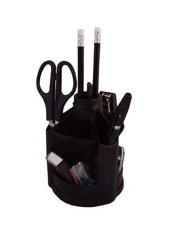 Удобный размер, на столе смотрится красиво и лаконично. Много разъёмов для мелкой канцелярии. В комплекте есть два карандаша, ручка, степлер, скобы для степлера, кпонки, скрепки, точилка. Всё хорошего качества, в цвет органайзера. Пластик хороший плотный. В целом товар соответствует описанию.