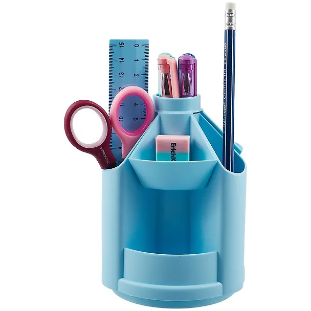Набор конечно удобный тем, что одновременно можно купить набор всей необходимой канцелярии одним разом. Единственное, не хватает для полного удобства еще строгалки. Ручек в наборе много, кстати все синего цвета, линейка маленькая, всего 15 сантиметров, но зато помещается в пенале. Ножницы заточены хорошо, бумагу режут на "ура". Подставка компактная, но даже еще остается место для других принадлежностей.