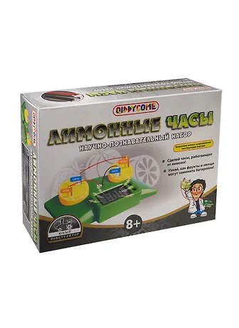 Научно-познавательный набор, позволяющий сделать часы, работающие не от батарейки, а от лимона, а также от других фруктов и овощей. Юный исследователь получит наглядное представление о том, как кислые и соленые жидкости проводят электрический ток. А красочная инструкция с интересными научными и историческими фактами превратит игру в увлекательный процесс познания! Рекомендуется для детей от 8 лет.