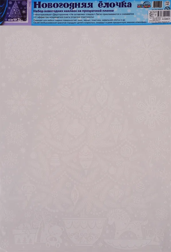 Если всматриваться в лист с наклейками, то ничего не увидите, но на стекле они заиграли свою главную роль. Красивые, оригинальные, яркие, блестящие. Легко отделяются, приклеиваются и отклеиваются. Отклеила их на их же лист и попробую использовать ещё на следующий год. Хороший товар