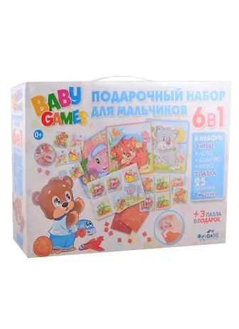 Подарочный набор 6в1 "Для мальчиков" - это уникальный набор, включающий в себя интересные красочные пазлы с милыми зверятами, будто сошедшими в детских открыток, а также целый ряд развивающих и обучающих настольных игр, благодаря которым ребёнок узнает, что такое лото и домино, а также потренирует память. Мини-пазлы, идущие в подарок к набору, помогут сделать чудесную встречу с любимыми героями незабываемой! Подарочный набор «6в1» – это не только отличная возможность сделать окружающий мир ярче, но и самый лучший способ увлечь ребёнка, рассказав ему в игре о пока ещё новых для него, но очень нужных и увлекательных вещах!