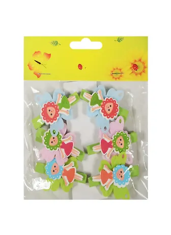 Набор остоит из 6 декоративных прищепок. Изделия используются для развешивания стикеров на веревке, маленьких игрушек, а оригинальность и веселые цвета прищепок будут радовать глаз и поднимут настроение. Размер прищепки: 5х4см.