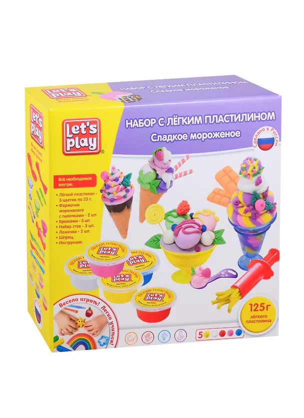 В наборе "Сладкое мороженое" ТМ Let's Play 20 предметов: 5 цветов лёгкого пластилина по 25 г, 2 формочки для эскимо с палочкой, 2 формочки для мороженого-рожка, 3 креманки, 3 фигурные стеки, 2 ложечки, шприц-давилка, цветная инструкция в картинках. Пластилин имеет лёгкую, мягкую текстуру. Его цвета легко смешиваются друг с другом. Слепленные фигурки застывают на воздухе за несколько часов, становясь лёгкими и воздушными, не трескаются и не крошатся. Материалы: пластилин, пластмасса, бумага. Внимание: пластилин НЕ пригоден для еды. Температура хранения и транспортировки: от +5 до +25 градусов. Товар сертифицирован. Упаковка: коробка (25х25х8 см).