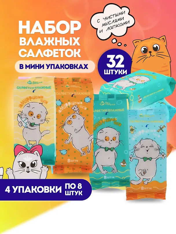 Набор компактных влажных салфеток с милым дизайном и рисунком кота Басика — отличный вариант, чтобы носить с собой.