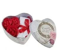 .В набор также входит полотенце, которое вместе с мыльными лепестками упаковано в красивую упаковку в форме сердца.