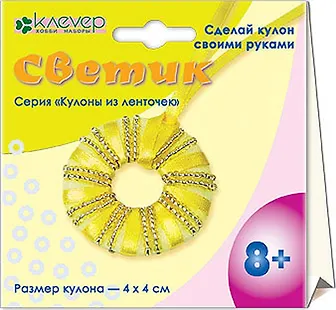 Кулон «Светик» - словно светлый солнечный лучик, попавший на колечко из нежных атласных и капроновых лент и переливающегося золотистого бисера - замечательное украшение для солнечной девочки! Набор «Светик» предлагает уникальную технику изготовления бисерного украшения — оплетение шаблона солнечными лентами и бисером при помощи проволоки.