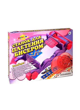 В наборе: станок для плетения бисером (в разобранном виде), держатель для бусинок, коробка для бисера и украшений, бисер (5 цветов), детали для серёжек, разноцветные нитки (6 шт.), инструкция.