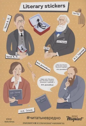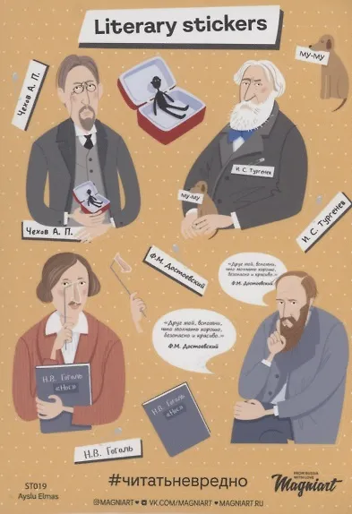 Отличные стикеры для любителей русской классической литературы. Портретами писателей и их цитатами можно украсить и конспекты, и ежедневник, и телефон или ноутбук. Прекрасно клеятся и отлично смотрятся.