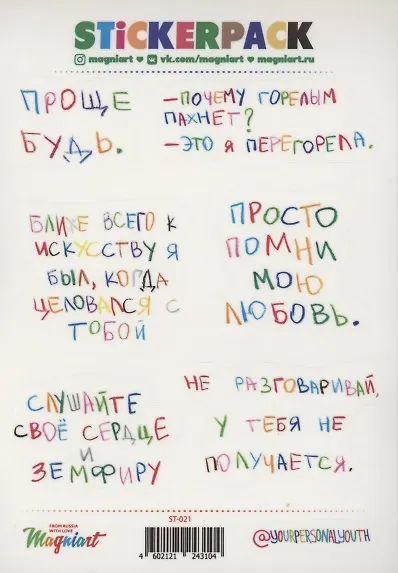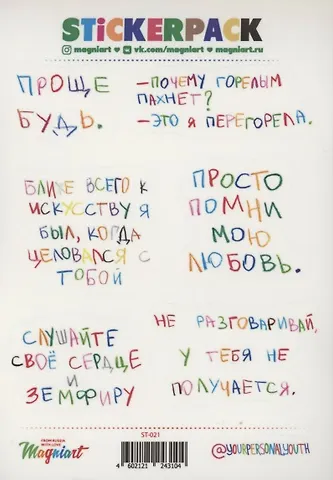 Наклейки очень понравились, по размеру идеально подошли, маленькими не показались. Яркие, привлекательные. Единственное, что мне не очень понравилось - цена, слегка завышена, и фон (текст не на прозрачном фоне, как бы мне хотелось и как я думала, а на белом). Но так тоже нормально. Сами цитаты тоже очень понравились, особенно с Земфирой:)