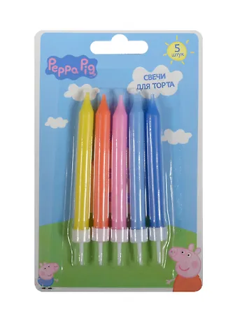 В наборе «Peppa Pig»: 5 разноцветных свечей для торта размером 7 х 0,8 см, 5 белых пластиковых держателей. Срок годности – 5 лет. Упаковка – блистер с европодвесом.
