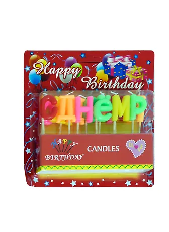 Набор разноцветных свечей в виде букв, составляющие надпись "С днём рождения, прекрасно подойдут для праздничного торта и порадуют именинника.