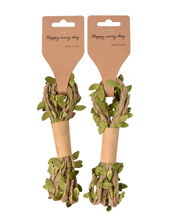 Джут с листочками очень качественный, красивый. Стоимость вполне приятная за такой товар, веревка плотная, листочки надежно закреплены, выглядит красиво. Есть такие же с белыми/голубыми/разноцветными листочками. Жаль что здесь нет фото товара, так то всё хорошо.