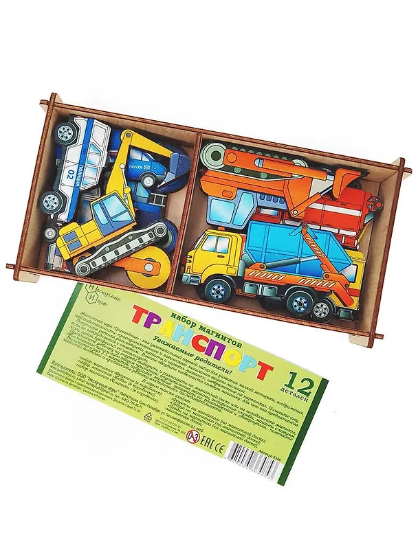 Магнитная игра "Транспорт" — это увлекательный игровой набор для развития мелкой моторики, воображения, наблюдательности, пространственного и логического мышления вашего малыша. Попросите ребенка рассмотреть магниты и назвать машинки, изображенные на картинках. Помогите ему, если он затрудняется с ответом. Вместе обсудите особенности каждой машинки: для чего она предназначена, люди каких профессий ее используют. Предложите ребенку по очереди выбирать и размещать на магнитной доске или на холодильнике магниты, объединенные каким-либо общим признаком: строительные машины, экстренные службы, машины с ковшом. Выложите в ряд 3-5 магнитов, попросите малыша запомнить их расположение и отвернуться,