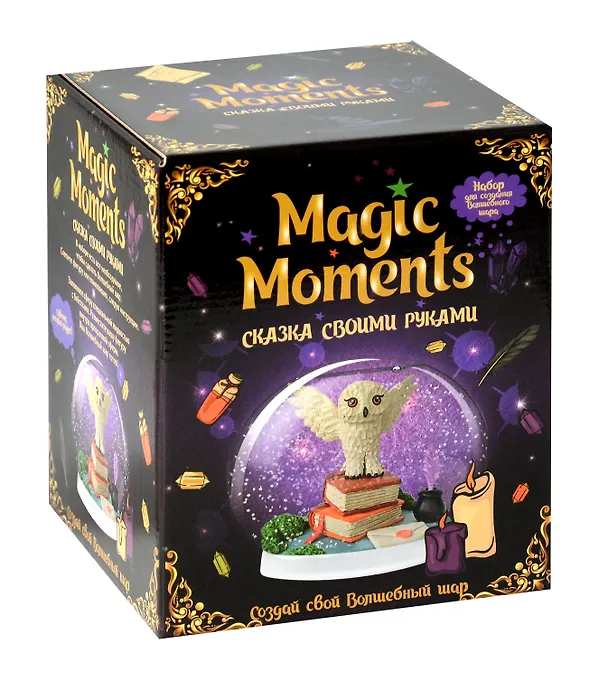В школе волшебства никак не обойтись без почтовой совы! Набор для творчества Сказочный позволит вам создать необычный шар с фигуркой совы, которая сидит на учебниках по магическим искусствам. Композиция лепится из пластилина по пошаговой инструкции из набора. Сделать волшебной птице перья и вылепить страницы учебников поможет стек, который также есть в коробке. У вас обязательно получится! Процесс лепки из пластилина отлично развивает моторику рук. Когда фигурка будет готова, прикрепите её к пластиковой подставке и поместите в шар с водой и блёстками. Как только вы потрясёте шар, начнётся настоящее волшебство!
