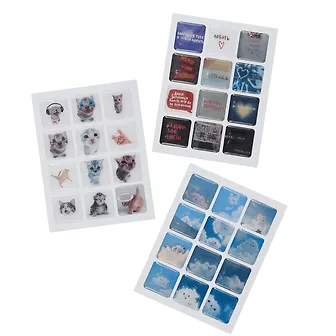 В упаковке 3 комплекта: с вдохновляющими надписями про любовь, котиками и облаками. Стикеры объёмные и влагостойкие, крепко держатся на любой гладкой поверхности. Ещё они многоразовые: можно переклеить на другое место, если понадобится, и не останется никаких липких отпечатков.