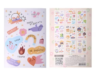 Набор состоит из 9 листов наклеек, каждый лист состоит из различных наклеек, которые имеют разный размер и форму. Их легко использовать, они уже вырезаны и готовы к нанесению на любую гладкую и ровную поверхность. Можно использовать в скрапбукинге, для составления различных композиций, а так же выделить важные элементы в ваших конспектах. Количество наклеек в наборе: 101