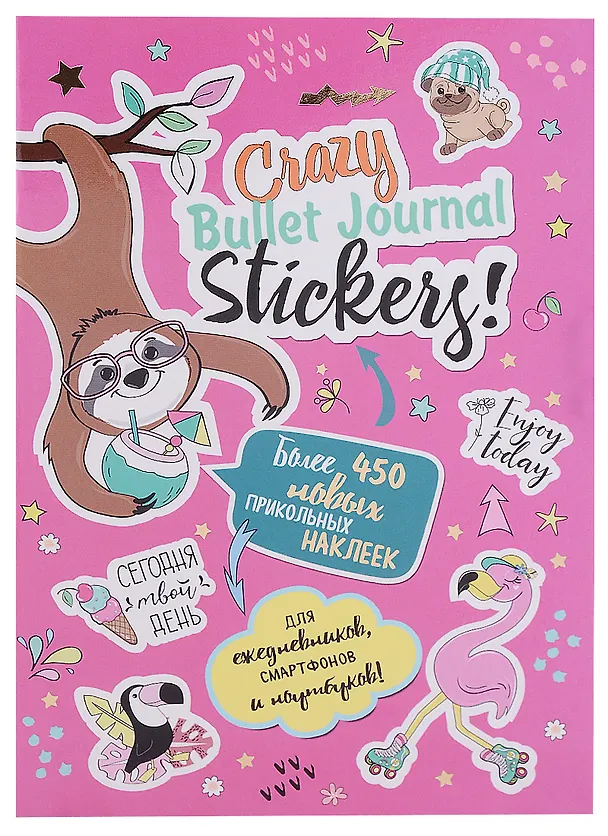 Коллекция ярких стикеров — это идеальное решение для творческих людей. Забавные котики и собачки, радужные единороги, фламинго, ленивцы, ламы и другие всеми любимые персонажи украсят ваш bullet journal, простой ежедневник, записную книжку или блокнот, создав лёгкое и игривое настроение. Помимо очаровательных зверушек, в этом сборнике вы найдёте наклейки с забавными и мотивирующими фразами на русском и английском языках, а также стикеры с элементами оформления в стиле bullet journal,