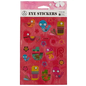 Наклейки очень красивые, основа из прозрачного тонкого пластика. Прочные и гладкие на ощупь, хорошо приклеиваются и держатся. Птички и цветы разного цвета и размера. У семи птичек из десяти глазки двигаются если встряхнуть, остальные три птички просто наклейки без подвижных элементов, цветы тоже простые наклейки. Глаза выпуклые, но когда приклеиваешь и закрываешь блокнот ничего не выпирает и не мешает.