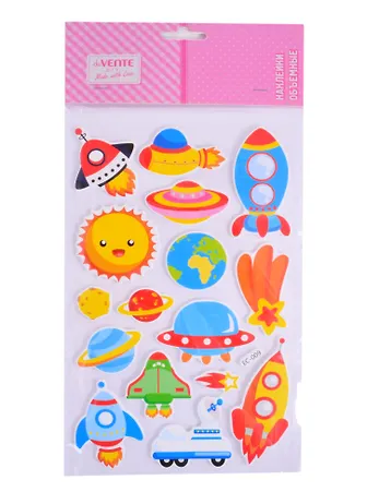 Объёмные наклейки deVENTE Spaceship помогут быстро оформить открытку, альбом или школьные тетради и добавить работе заметный рельеф. Элементы из мягкого фоамирана приятны на ощупь, легко отделяются от основы и хорошо держатся на бумаге, картоне и гладких поверхностях. Космические мотивы подойдут для детских поделок от 3 лет, тематических проектов и аккуратного декора подарочной упаковки — когда хочется добавить чуть больше настроения.