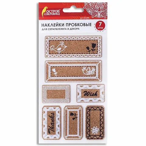 Пробковые наклейки ОСТРОВ СОКРОВИЩ предназначены для украшения альбомов, открыток, фоторамок, подарочной упаковки и предметов интерьера. Благодаря качественному клеевому слою наклейки надёжно фиксируются на различных видах поверхности.
