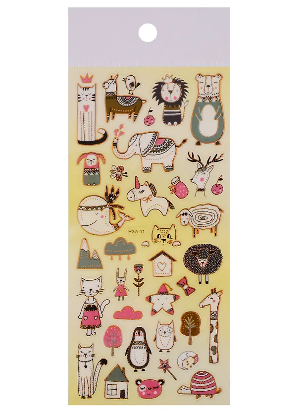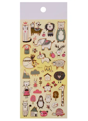 Очень понравились мордочки животных, особенно овца, жираф, лев и медведь. Действительно все прикольные. Лист один, но наклеек много, есть и большие и маленькие, и в наборе не только животные, но и цветочки, домики, деревья, бабочки и другие мелкие изображения. Наклейки красочные, плотные, с позолотой, все животные нарисованы по-разному, повторов нет. Приклеиваются хорошо.