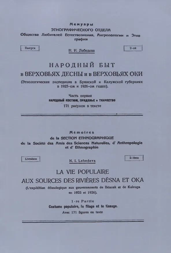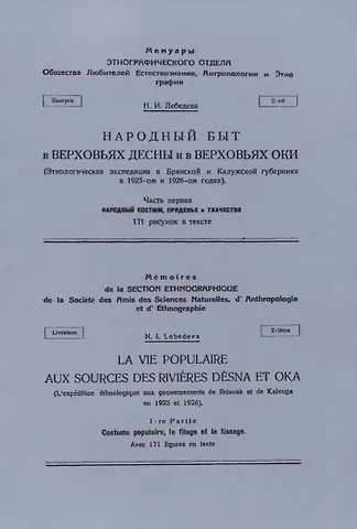 Этнологическая экспедиция в Брянской и Калужской губерниях в 1925-ом и 1926-ом годах. 171 рисунок в тексте. Описание быта, обычаев, приемов народного ремесла. Книга является библиографической редкостью.