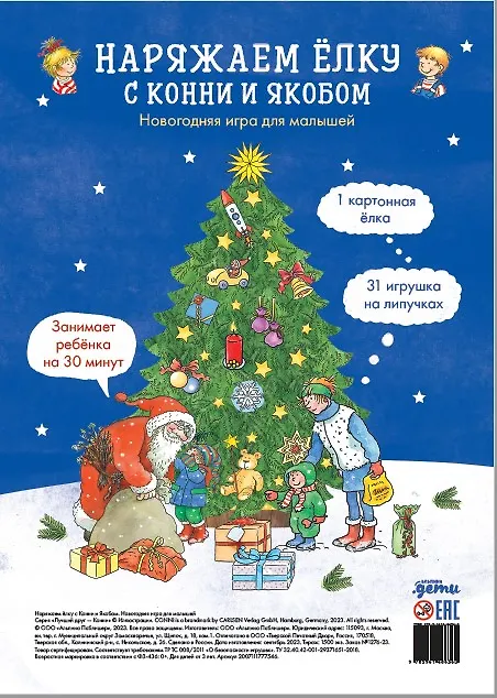 Картонная ёлка — отличное украшение детской для ребят от 3 лет и старше. Малыши смогут украсить новогоднее дерево яркими игрушками на липучках, выполненными в стиле книг про любимых героев — Конни и Якоба.