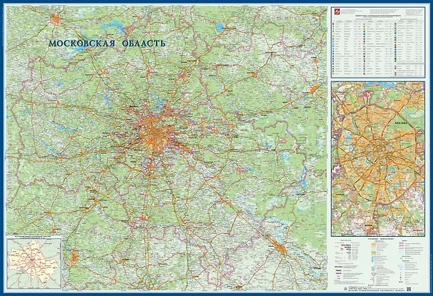 Настенная географическая карта Московской области 1,57*1,07 м. Обозначены границы районов и городов областного подчинения, подписаны названия районов и их центры. Даны все населенные пункты, подробная дорожная сеть, охотничьи и рыболовные базы, памятники архитектуры, места отдыха. Цветом выделены леса и дачные участки. На врезке дана более подробная карта окрестностей Москвы. Качественная полиграфия. Для размещения карты на стену можно использовать двусторонний скотч.