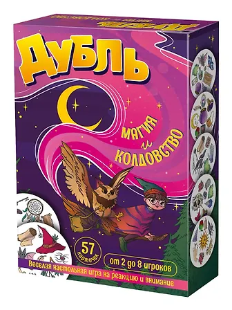 Веселая игра на внимание и реакцию для всей семьи. В состав игры входит 57 круглых карточек, на каждой из которых размещено 8 рисунков. При этом на двух любых карточках всегда есть только один общий рисунок. Цель: нужно быстрее других находить одинаковые картинки на открытых карточках. Игра Дубль тренирует внимательность и скорость реакции. Она будет интересна как детям, так и взрослым, и подойдет и для детских праздников, и для семейных игр, и для посиделок с друзьями.