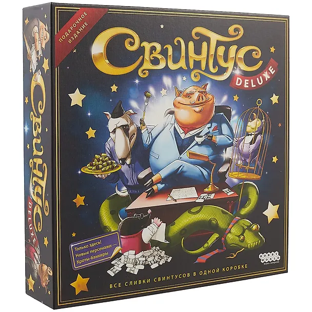 Как-то довелось поиграть в "свинтус 2", чем был очень впечатлён. А тут Делюкс, со всеми фишками, прелестью из других частей! Игра эта очень крутая, впервые видел, чтобы правилами оговаривалось, как обманывать других игроков, задания, уловки - для большой компании самое то! Можно увлечься и не заметить как пролетят несколько часов игры. Отдельная прелесть в том, что ты не можешь быть уверен до конца, как скоро выиграешь, потому что игра может перевернуть свой ход в любой момент! Однозначно советую к приобретению