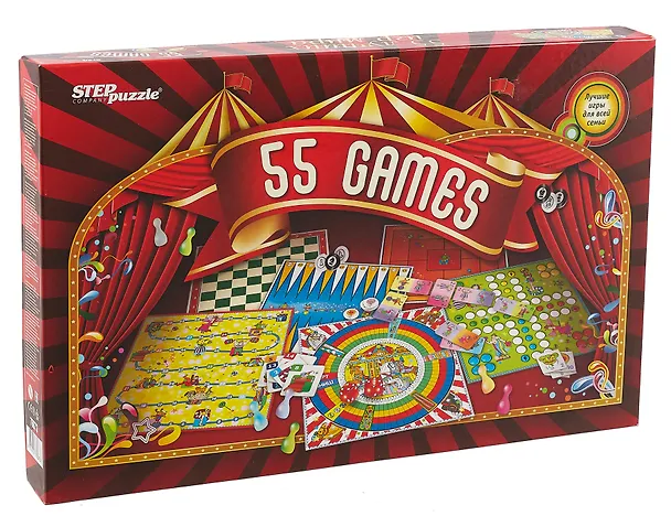 55 лучших игр мира в одной коробке! В этой игре вы найдете: мемо и карточные игры, шахматы и шашки, нарды, различные игры-бродилки и игры с кубиками. Все игры входящие в комплект очень разнообразны. Будут интересны как детям, так и их родителям. Для детей от 3-х лет.