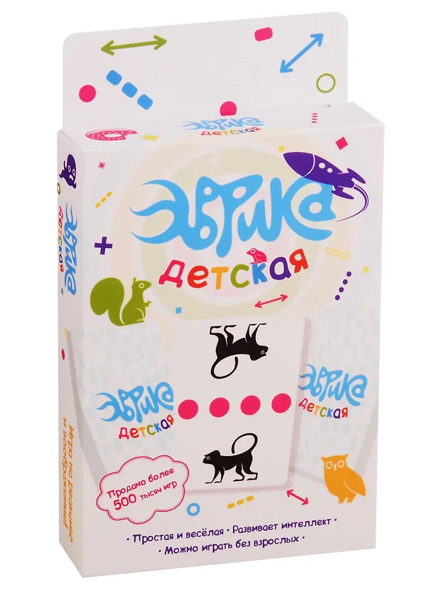 Игра на реакцию и воображение! Тяните карту из колоды и кладите перед собой. Теперь ваш сосед тянет карту и так далее. Если у вас с кем то совпали символы, придумайте первым слово на ту же букву, что и картинка на чужой карте. Получилось? Забирайте себе карту. Игра продолжается. Когда колода закончится, побеждает тот, кто набрал больше всех карт. В детской Эврике мы сделали картинки вместо слов, чтобы детям было интереснее и проще играть.