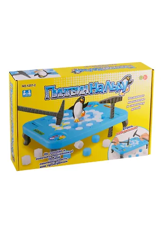 «Пингвин на льду» - увлекательная настольная игра, рассчитанная на развитие меткости. Количество игроков: 2. До начала игры в основу нужно вставить кубики и поставить её на ножки, а пингвина установить на кубик посередине. Задания определяются значением стрелочки, выпавшим на рулетке, например, «Выбей 2 синих кубика» или «Выбей 1 белый кубик». Участнику предстоит очень аккуратно выполнить задание, используя специальный молоточек, и при этом не уронить фигурку пингвина.