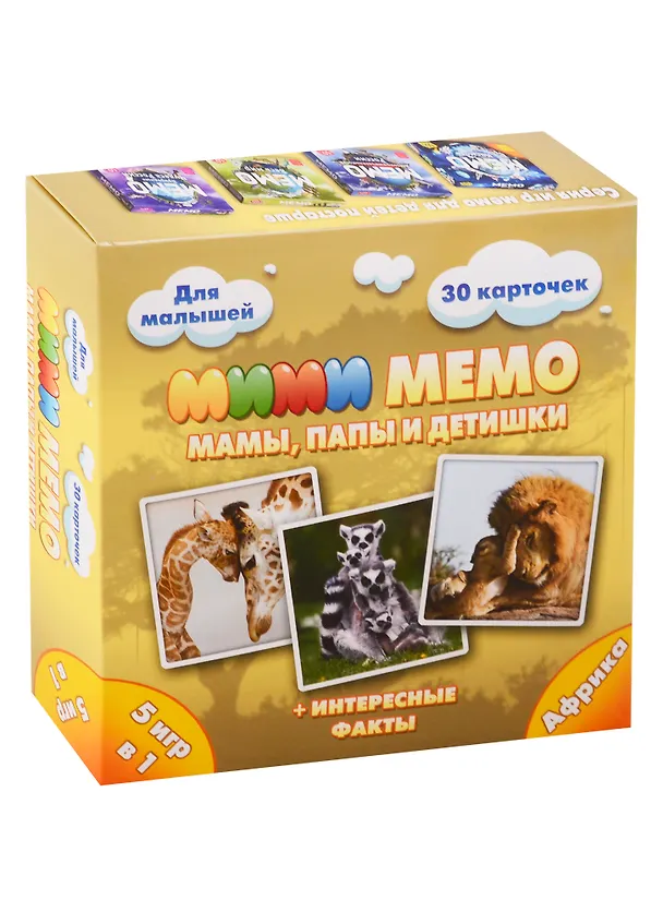 МиМи Мемо" - познавательная игра для тренировки визуальной памяти, расширения кругозора и словарного запаса. Она поможет развить внимательность и умение сопоставлять и сравнивать. Игра научит детей не только отличать одних животных от других, но и запомнить, как называются звериные семьи. Как "зовут" маму папу и детеныша. В наборе 30 карточек из плотного картона с парными изображениями. Также в комплекте буклет-инструкция с описанием семей, забавных фактов и привычек животных, изображенных на карточках.