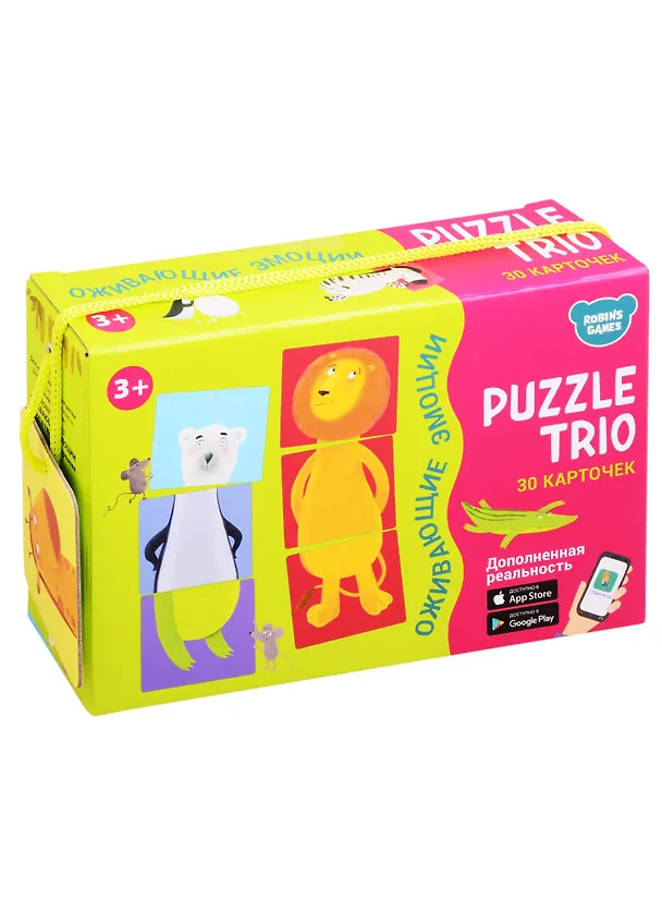 Игры оживают в дополненной реальности и озвучены актрисой Ириной Муравьёвой. Скачайте бесплатное приложение в Google Play и App Store и следуйте инструкциям в приложении. В набор входят 30 двусторонних карточек, из которых можно сложить 10 животных и 10 историй, иллюстрирующие разные чувства и эмоции.