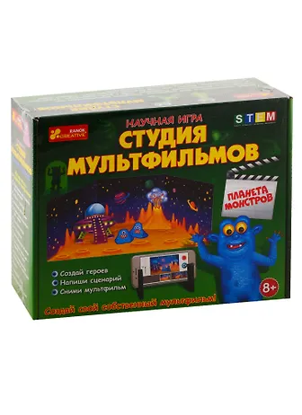 Перед вами настоящая маленькая киностудия, позволяющая создавать мультипликационные анимированные фильмы. Главными героями станут веселые и дружелюбные монстрики, которые живут на своей планете. Чтобы самому сделать мультфильм, необходимы всего лишь смартфон планшет, цифровая камера и бесплатное приложение из интернетмагазина. А дальше самое интересное. Следуя пошаговой инструкции в процессе создания анимированного фильма, дети познакомятся со всеми этапами киносъемки: от самостоятельно написанного сценария до готового мультика, его раскадровки, создания пластилиновой и объемной анимации, озвучивания и монтажа. Этот набор даст возможность каждому ребенку ощутить себя в роли режиссера, операт