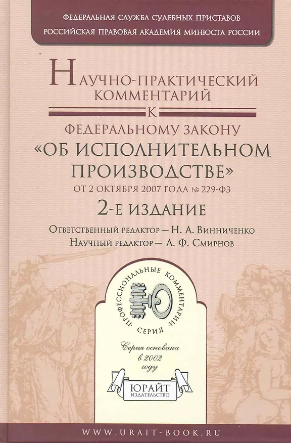 Настоящее издание содержит постатейный научно-практический комментарий к Федеральному закону от 02.10.2007 229-ФЗ Об исполнительном производстве и является одним из первых системных разъяснений его положений. При подготовке книги использованы материалы сложившейся судебной практики, юридической прессы, а также методические материалы Федеральной службы судебных приставов. Во втором издании учтены все изменения в законодательстве по состоянию на 1 февраля 2010 года. Предназначено для сотрудников органов принудительного исполнения, судебной системы, органов, организаций и граждан, исполняющих требования, содержащиеся в судебных актах, актах других органов и должностных лиц, студентов, аспи