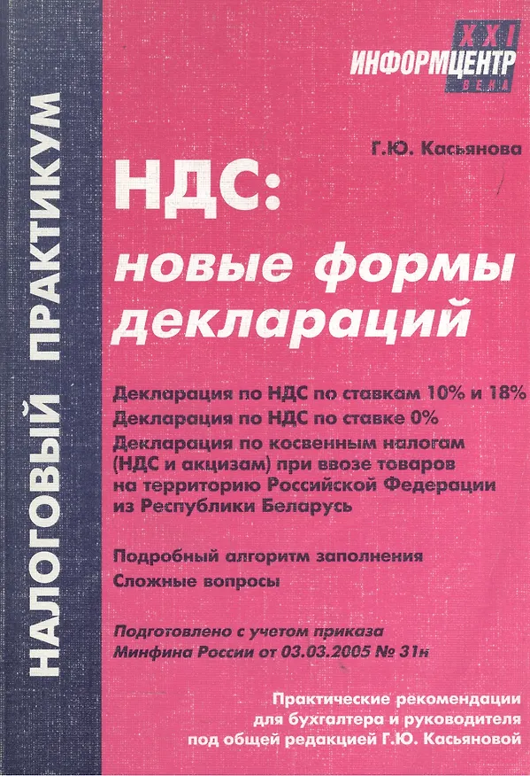 Порядок исчисления и уплаты НДС и составления отчетности по новым формам, введенным приказом Минфина России от 03.03.2005 №31н. Подробно рассмотрены вопросы расчета, уплаты и отражения в отчетности всех основных налогов, уплачиваемых организациями. Правила отражения доходов. Определение налоговой базы. Порядок применения вычетов по налогу. Исчисление НДС по разным ставкам. Налоговые льготы. Учет другой информации по НДС в соответствии с Налоговым кодексом РФ. Декларация по НДС по ставкам 10% и 18%. Декларация по НДС по ставке 0%. Декларация по косвенным налогам (НДС и акцизы) при ввозе товаров на территорию Российской Федерации из Республики Беларусь. Подробный алгоритм заполнения. Сложные в