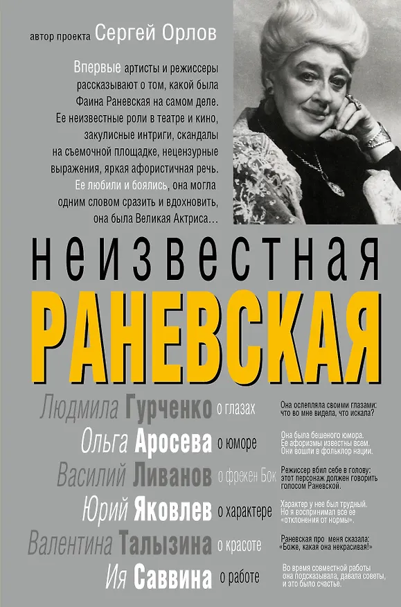 .Жизнь актрисы - во многом загадка, тайна, к раскрытию которой можно только приблизиться. И в этом помогают воспоминания ее знаменитых современников, среди которых И. Саввина, Л. Гурченко, В. Талызина, О. Аросева, Ю. Яковлев, В. Ливанов, Е. Камбурова и многие другие. Со страниц книги звучат их знакомые голоса и рассказы о встречах с Раневской на съемочной площадке, где не обходилось без курьезов, о совместной работе в театре, полной смешных, ироничных ситуаций, о дружбе, любви, сострадании… Рассказы, которые читатель услышит впервые и которые не
