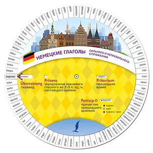 Эффективный способ запомнить спряжения немецких глаголов. Подвижная часть диска-вертушки поможет быстро найти основные временные формы самых употребляемых глаголов немецкого языка.