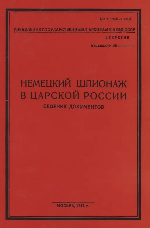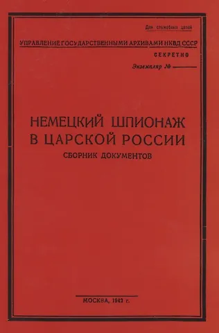 Репринт с издания. Москва, 1942. Сборник документов опубликованный Научно-издательским отделом УГА НКВД СССР представляет собой первую попытку издания исторических документальных материалов о деятельности германской разведки на территории русского государства. Они дают довольно ясное представление как об основных методах шпионажа, так и об основных шпионских кадрах. Публикуемые документы извлечены из фондов Центрального государственного Исторического архива и Архива Октябрьской социалистической революции. Содержание: Раздел I. Общие принципы организации немецкого шпионажа в России; Раздел II. Использование германской разведкой в целях шпионажа и подрывной работы немецких торгово-промышленных