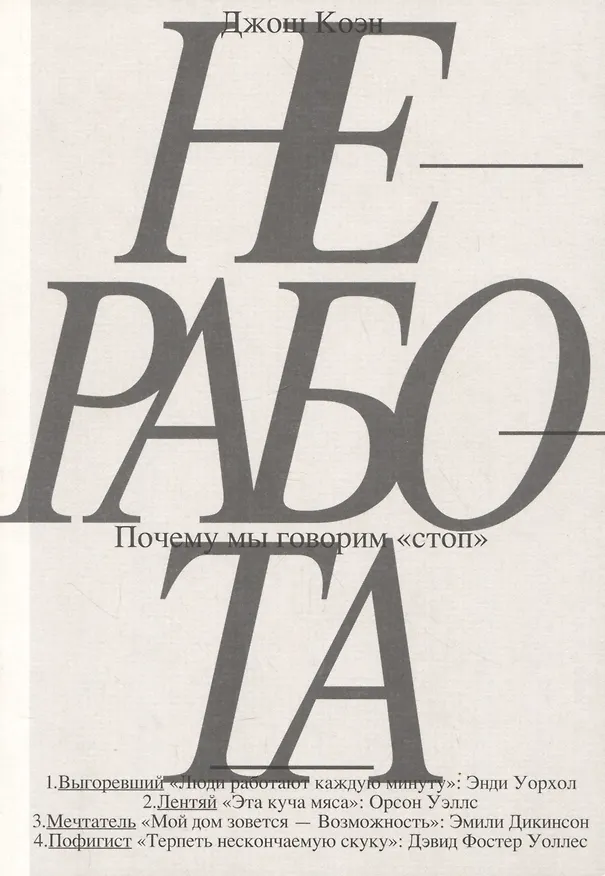 Книга британского психоаналитика Джоша Коэна посвящена нашим отношениям с трудом, точнее — заложенному в каждом из нас желанию не работать, которое отнюдь не безоблачно сосуществует с желанием работать — и добиваться успеха, престижа, благополучия, — причем, как полагает автор, является не менее, а возможно, и более важным, даже определяющим для человека. Это желание знакомо нам с детства, когда оно с легкостью удовлетворяется, но мы учимся подавлять его и привыкаем отдавать все силы работе, порой забывая, что жизнь ею не исчерпывается. Иногда результатом становятся большие достижения в избранной нами профессии, иногда — депрессия, иногда то и другое вместе. Как быть с потребностью в «нерабо