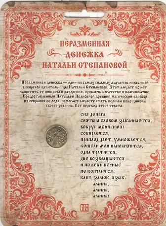 .НЕРАЗМЕННАЯ ДЕНЕЖКА — один из самых сильных дмулетоа известной сивирской целительницы Ндтдльй Степановой, тАйну создания которого сохранили представители ее родл. Этот дмулет может защитить от нищеты и разорения, привлечь богатство и Благополучие.
