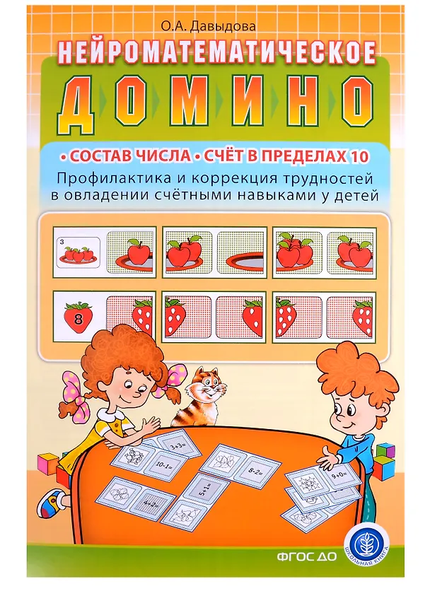 «Нейроматематическое домино» для детей от 5 лет представлено в виде развивающих игровых упражнений, разделённых на две части. Первая часть — «Состав числа» — содержит на «зашумлённом» фоне 72 разрезные карточки-фишки с изображением половинок разных предметов на левой и правой стороне, которые после разрезания надо правильно сложить для получения заданного числа: 2,3,4,5, б, 7,8,9,10. Вторая часть — «Счёт в пределах 10» — включает 48 карточек-фишек, на правой стороне которых даны действия сложения и вычитания в пределах 10, а на левой — разное количество наложенных друг на друга изображений предметов, соответствующее результату действий сложения и вычитания. Выполняя игровые упражнения путём нахождения и выкладывания нужной карточки-фишки, ребёнок производит арифметические операции счёта, вычисления, соотнесения результатов вычисления и счёта, их логического сопоставления. Таким образом, «Нейроматематическое домино» — это увлекательная математическая игра, направленная не только на наглядно-зрительное усвоение дошкольниками устного счёта, овладение составом чисел первого десятка, но и развитие внимания, памяти, логики. Взрослым, родителям пособие поможет проверить и подкорректировать те области начальных математических знаний и умений, в которых ребёнок испытывает затруднения.