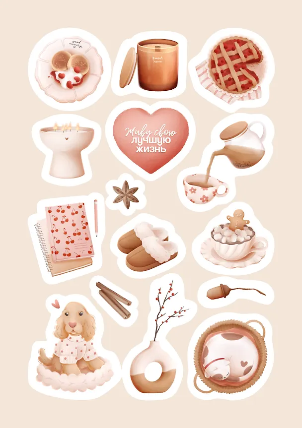 Среди этих стикеров есть милые и уютные, вроде котенка в корзине или чашки чая, пирога. Но большая часть мне не подошла, обилие зеленых растений, странные надписи вроде «нега денег», «нежно денежно», которые видимо являются отсылками к книгам автора, их я не использую, есть кстати и стикер с самой книгой автора, то есть видимо, это больше для фанатов. У меня же большинство стикеров остались не использованными, не подошли по стилю рисовки и смыслу. Хотела что-то уютное для оформления записей, но стиль не подошел. Вот даже есть стикер с круассаном, но он наполовину полит какой-то зеленой жижей, это портит всю эстетику, какие-то надписи совсем уж наивные и глупые, не вдохновляющие.
