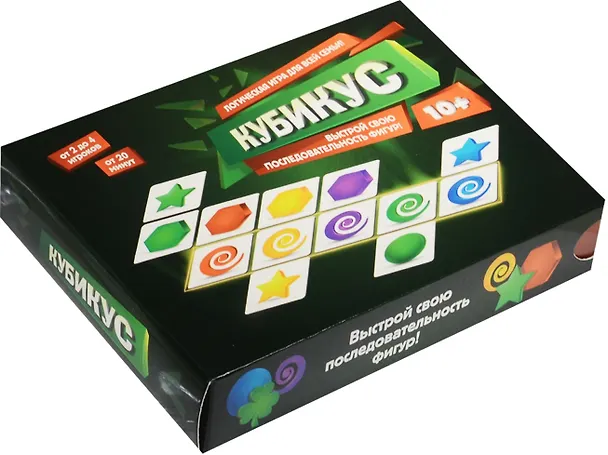 Внутри небольшой коробочки находятся карточки с пятью фигурами разных цветов. Выкладывайте их по принципу домино по очереди. Картинки должны совпадать по цвету или форме. Если получилась цепочка, вы зарабатываете балл. Чем длиннее цепочка, тем больше баллов в вашей копилке.