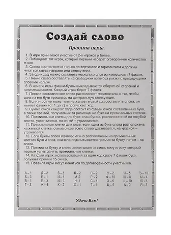 Из букв необходимо составлять слова. В набор входит: картонные фишки букв—104 штуки, подставка для букв— 2 штуки, негнущееся игровое поле — 1 штука, мешок для хранения букв— 1 штука, инструкция.