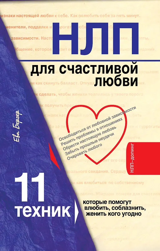 Если вы хотите найти свою половинку и жить вместе долго и счастливо... Если вы не знаете, как улучшить отношения с любимым человеком... Если вы надеетесь вернуть любовь или сделать более яркой вашу семейную жизнь... Тогда новая книга Евы Бергер, автора оригинальных НЛП-методик, - для вас! Законы НЛП помогут вам избавиться от ложных установок (вроде «венца безбрачия»), улучшить «сложные» отношения (или вообще освободиться от них), влюбить в себя кого угодно и найти настоящую любовь.