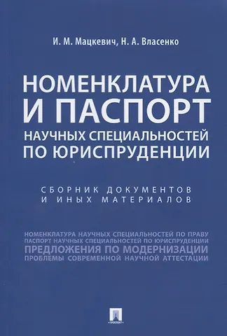 Сборник продолжает серию изданий по проблематике модернизации номенклатуры и паспорта научных специальностей по юриспруденции (Власенко Н. А., Мацкевич И. М. Модернизация специальностей в юриспруденции. Сборник материалов по итогам подготовки паспорта специальностей научных работников. М., 2012; Мацкевич И. М., Власенко Н. А. Паспорт специальностей научных работников по юриспруденции. Проект и итоги. М., 2015).